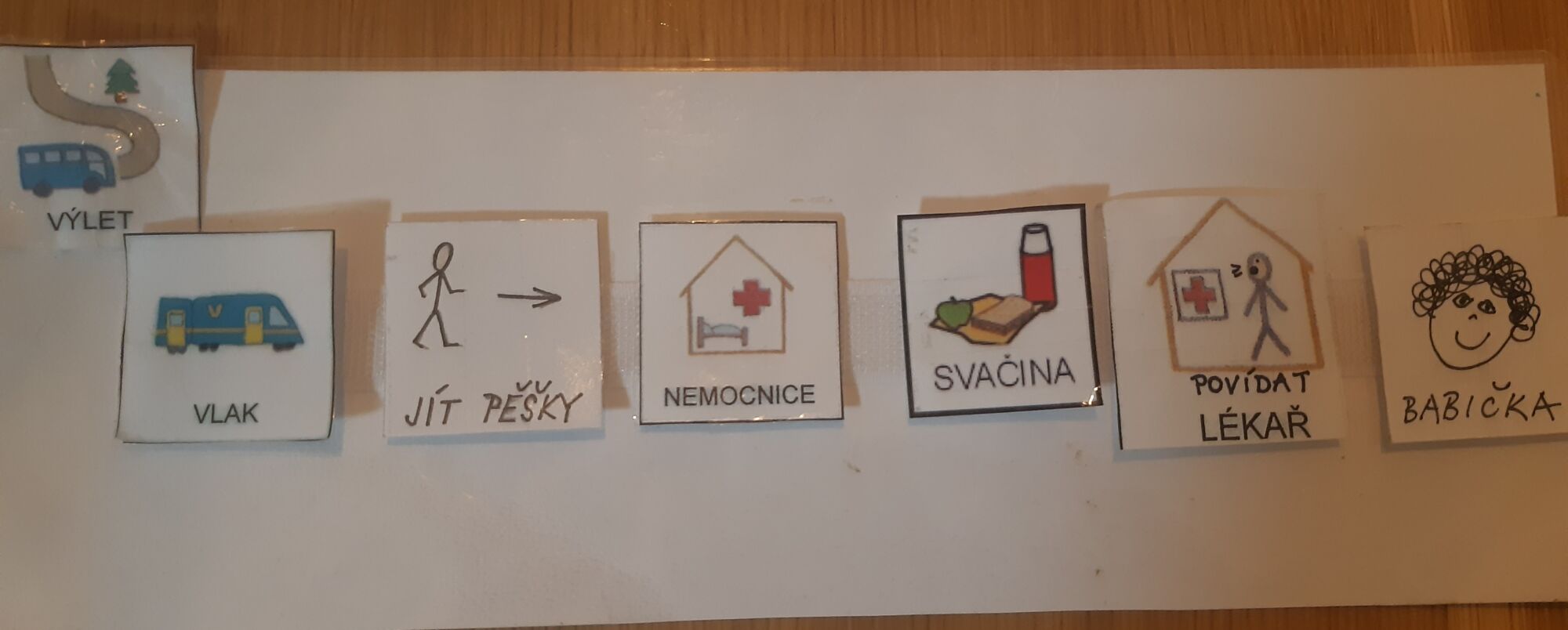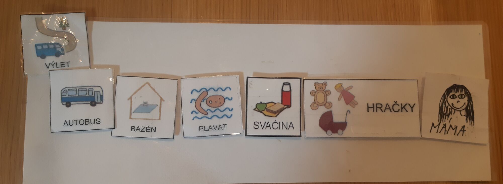 Honzík, chlapec s PAS, který je integrován u nás ve 2. třídě, navštěvuje s námi plavecký kurz. Protože dojíždíme na kurz do města autobusem, domluvili jsme se s rodiči, že ho dovedou na určený čas, těsně před začátkem, k bazénu a pak si ho opět u bazénu vyzvednou. Čas strávený v bazénu určujeme dle aktuálního rozpoložení Honzíka a zbývající čas má ve struktuře daný pro svačinu a hraní. Zda svačinu a hraní absolvuje s námi nebo až přijdou rodiče, už Honzík neřeší. Potřebuje jen vědět, jak po sobě budou dané činnosti následovat a kdy se rodiče objeví. Na poslední lekci s námi zkusil jet už ze školy autobusem. Přikládám tedy schéma výletu vytvořenou pro tento den, viz obrázek č. 1. Dodávám na ukázku také schéma výletu-exkurze do nemocnice z 1. třídy, viz obrázek č. 2.