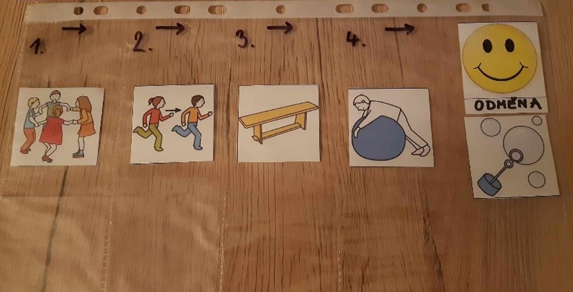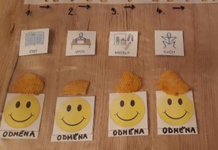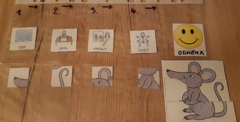 Obr. č. 1 a č. 2 Honzík má nastrukturované 3 úkoly a za každý získává jeden obrázek oblíbeného zvířátka. Po splnění úkolu, číslo úkolu otočí a vezme z košíku fotku zvířátka a umístí na přichystaná okénka na dřevěné liště-ta jsou označena smajlíkem ODMĚNA.