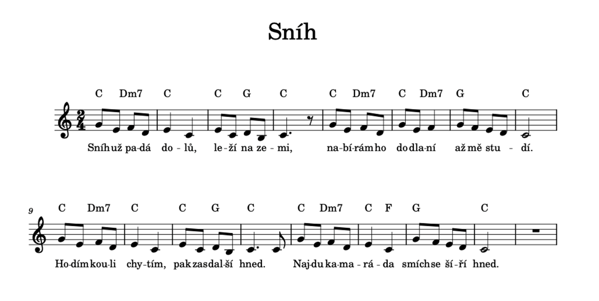 Pro doplnění zimních hudebních her vznikla krátká a snadno zapamatovatelná písnička s názvem „Sníh“, kterou lze využít jako úvodní naladění na zimní aktivity, součást hudebního příběhu nebo jako závěrečnou zklidňující část hodiny.