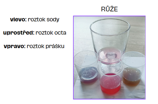 Do kelímku, nebo hmoždíře dejte dostatek okvětních lístků růže a přidejte vodu, pomocí lžičky nebo paličky míchejte a drťte lístky růží, po nějaké chvilce – zhruba 5-10 minut se začne uvolňovat barvivo, které obsahuje anthokyany. Anthokyany jsou přirozené pH indikátory a mění barvu podle pH. Výluh z růží pomocí pipety přeneste do kelímků, nebo pokud máte, tak zkumavek.