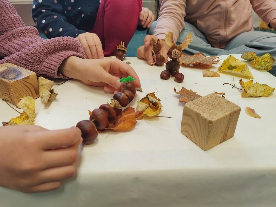 Tvoření: výroba zvířátek, postaviček, autíček z kaštanů, špejlí a přírodnin. Opět je důležité dopomoci dětem s propichováním kaštanů, abychom předešli úrazu. Děti necháme volně tvořit podle své fantazie. Než figurky odneseme na výstavku, ještě si s nimi trochu pohrajeme…