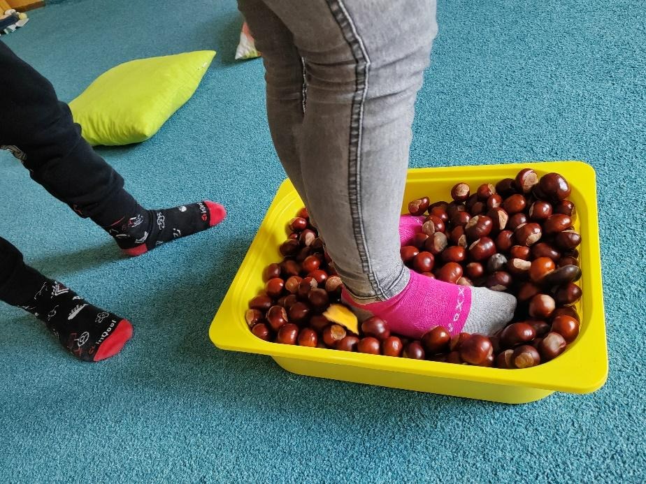 V oblibě mám právě předávání různých předmětů různými způsoby a dnes si to vyzkoušíme právě s kaštanem. Nejen, že je to zábava, učení se spolupráce, ale i rozpohybování prstů a rozvolnění dlaní jako motorické cvičení. Děti sedí v kruhu, vychovatelka vyšle jeden kaštan, který se k ní musí z druhé strany vrátit. Snažíme se, aby nikomu nespadl.