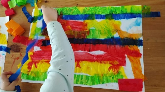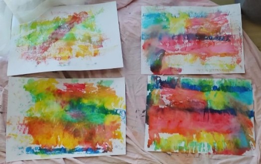 Jak na to? Navlhčíte čtvrtku vodou, postupně pokládáte pruhy krepového papíru, lze i překrývat, opět trochu postříkáte a navlhčíte vodou, barva v krepovém papíru se začne uvolňovat.