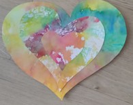 Pomůcky: čtvrtka A3, krepový papír na stříhaný na proužky (různé barvy), rozstřikovač s vodou, šablona srdce (2 nebo 3 velikosti), nůžky, lepidlo