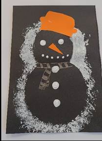 2. Šablonu přiložíme na černou čtvrtku a bílou temperou pomocí houbičky tupujeme okraj sněhuláka. Šablonu sundáme. Vynikne obrys.