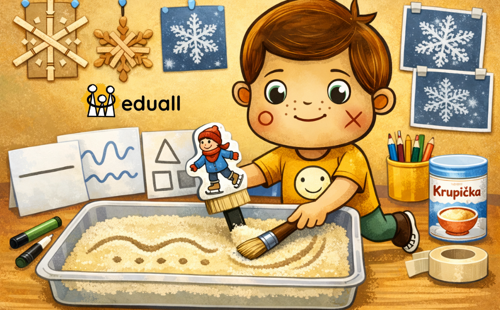 Do sypké krupice se dobře kreslí tvary, a navíc evokuje sníh. Krupici nasypte do plastového boxu a na papíry nakreslete několik variant čar a tvarů pro nácvik grafomotorických dovedností (rovné čáry, vlnovky, spodní a horní klička, krátké čárky, geometrické tvary). Nakreslete malou postavu bruslaře či bruslařky a připevněte ji izolepou k plochému štětci u strany, kde jsou štětičky. Pohybem štětce budou děti napodobovat bruslení a zároveň si i cvičit základy k budoucímu psaní.